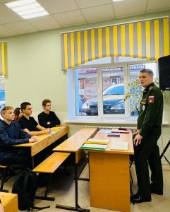 О видах и родах войск в РФ, их назначении и роли в безопасности страны, а также о правовых основах военной службы рассказал будущим юристам майор Дружинин А.О.